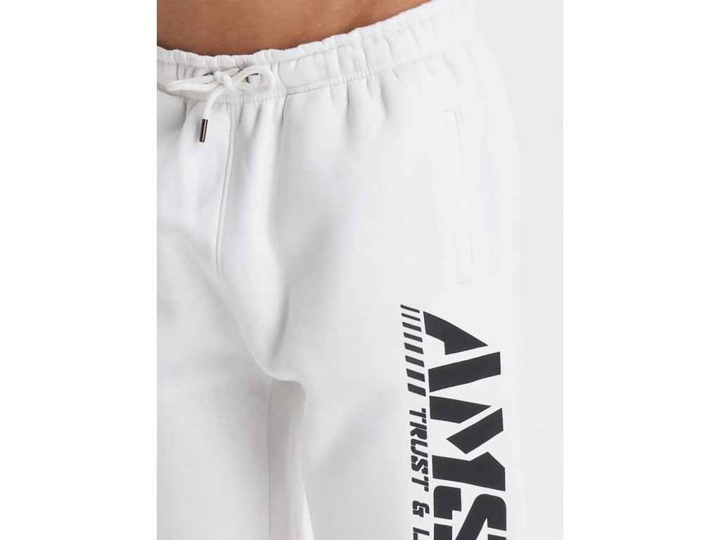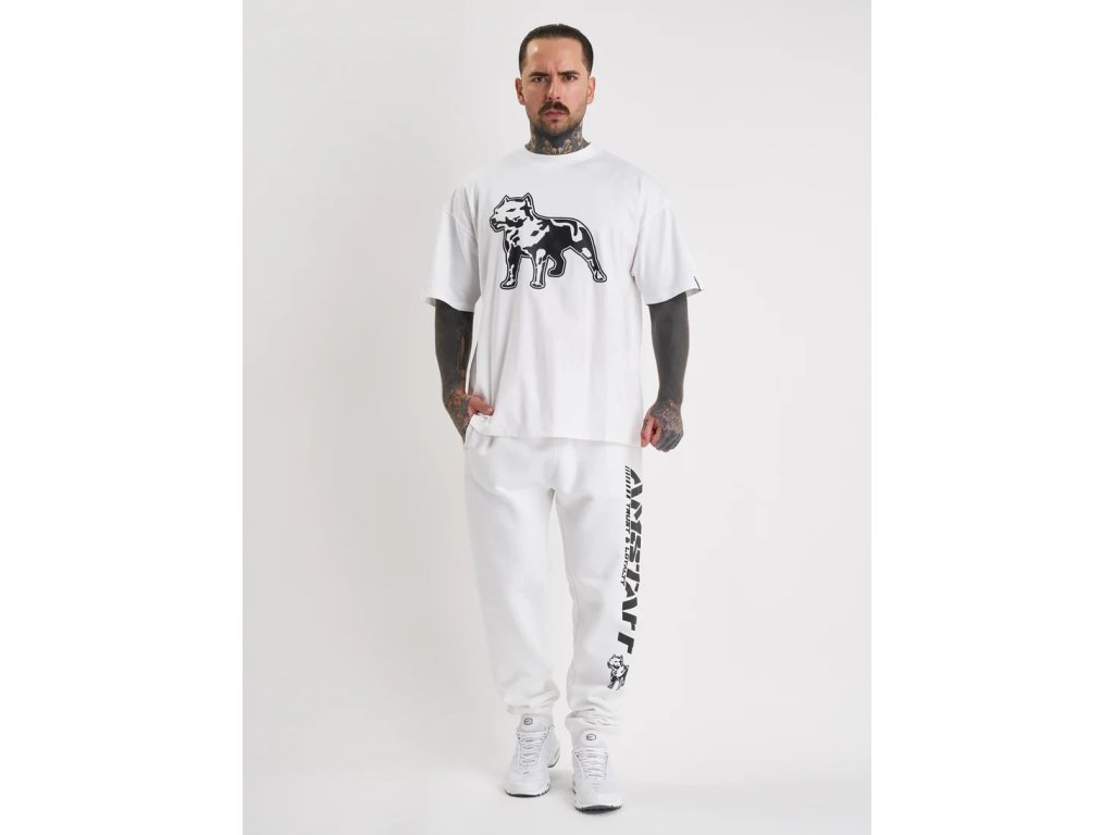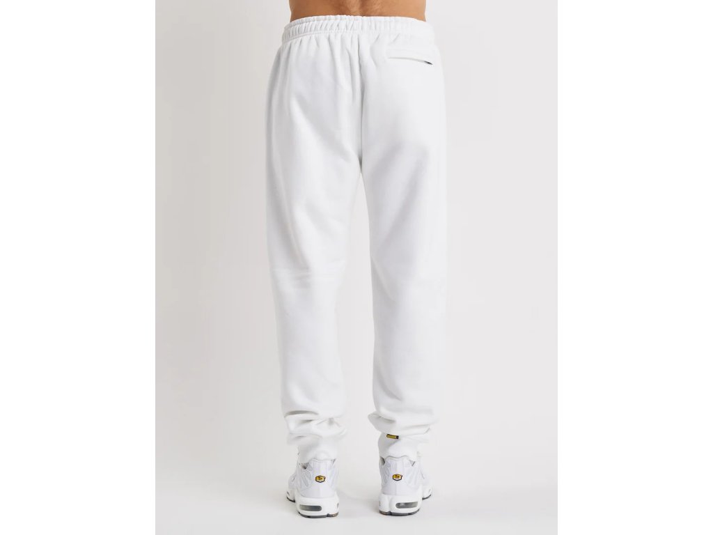 Bílé tepláky s černým potiskem loga.