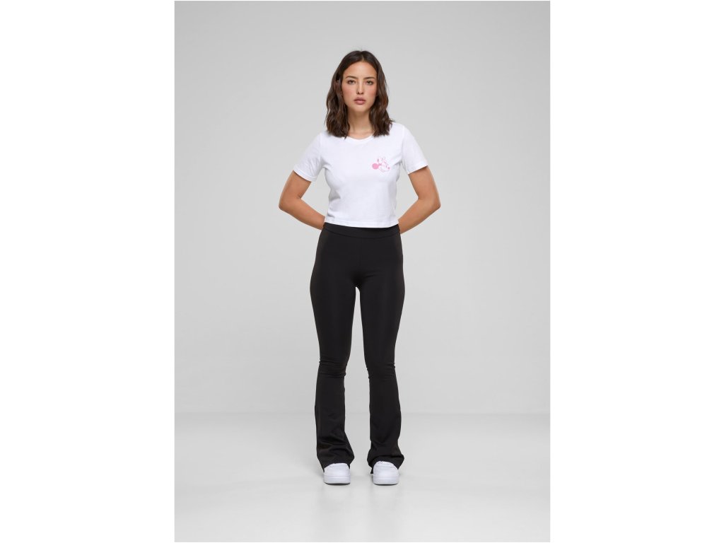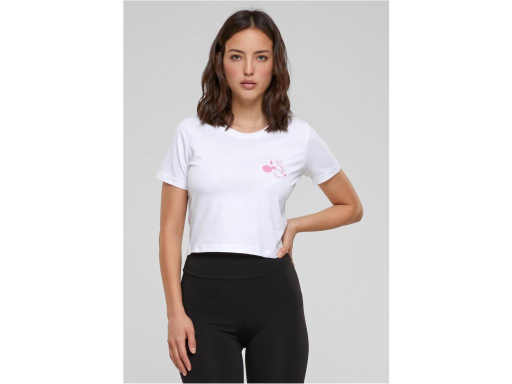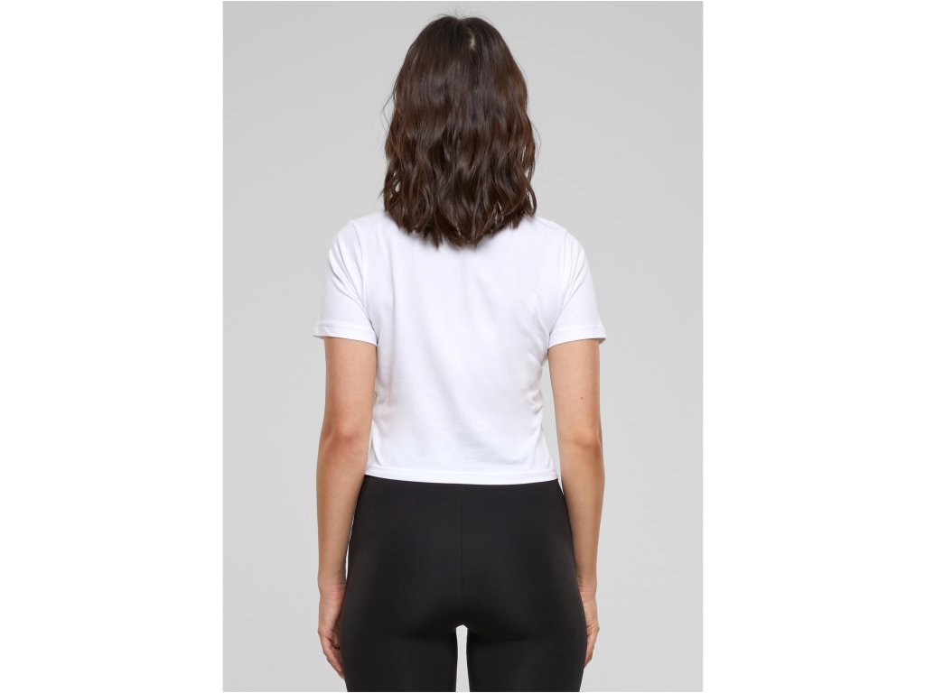 Bílé triko s krátkým rukávem s potiskem na hrudi.