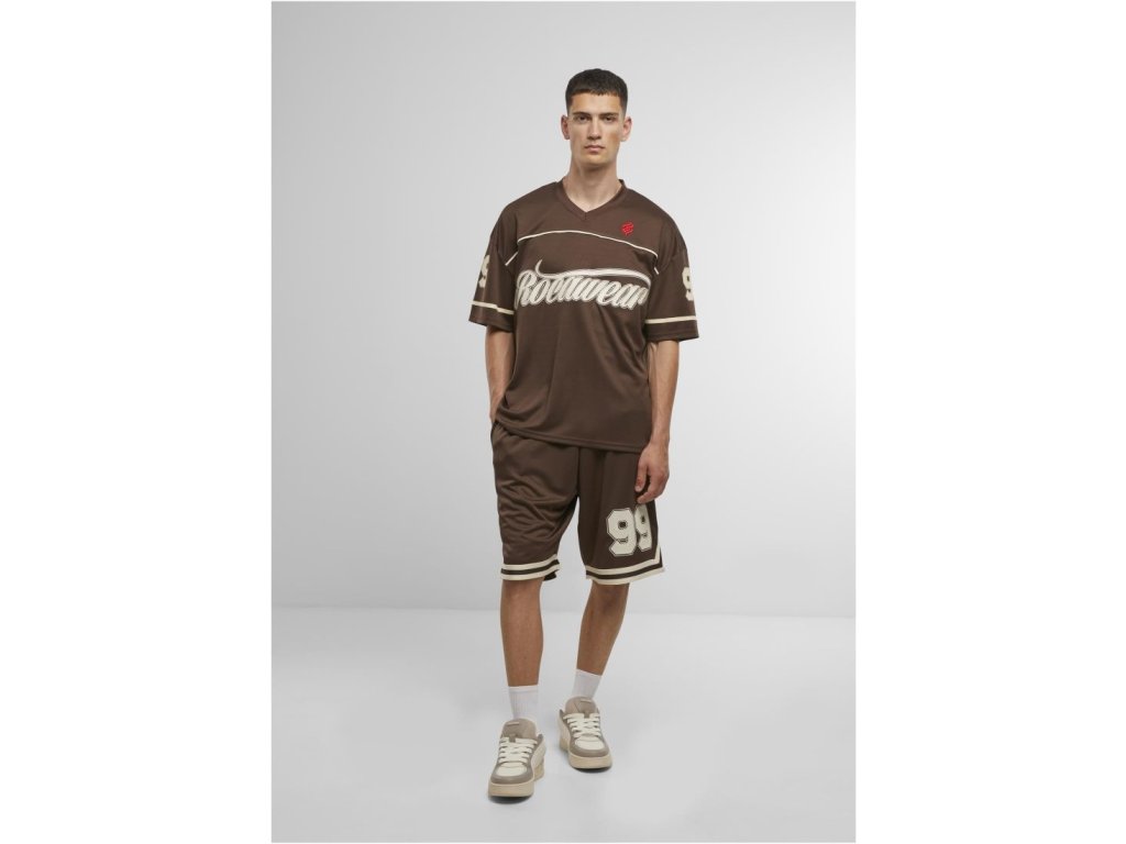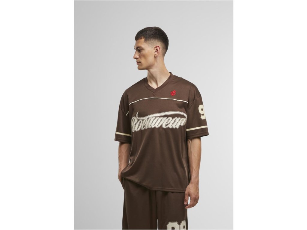 Dres hnědé barvy s logem značky na hrudi i na zádech.